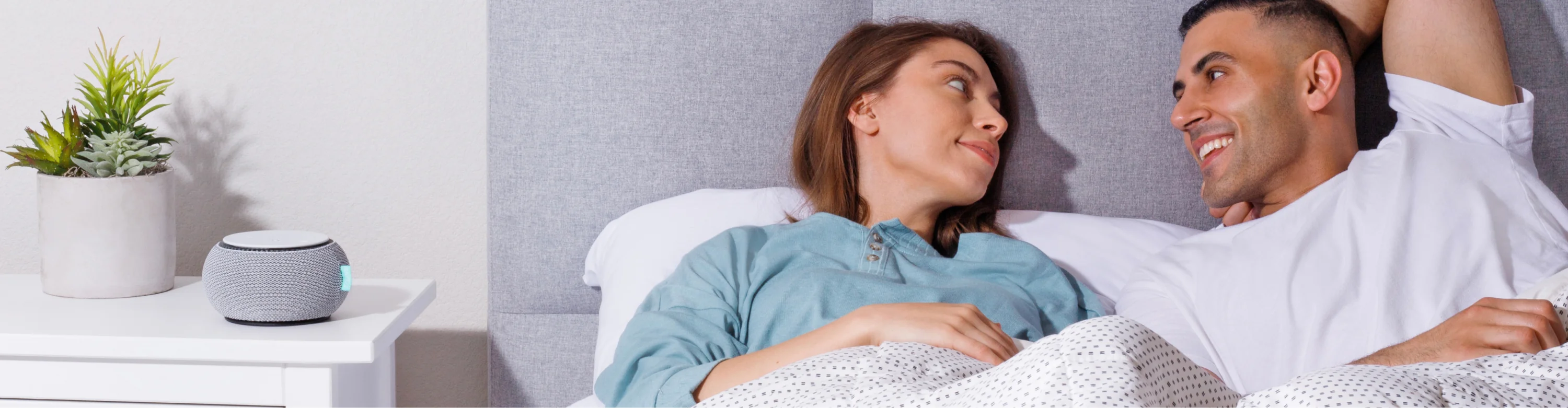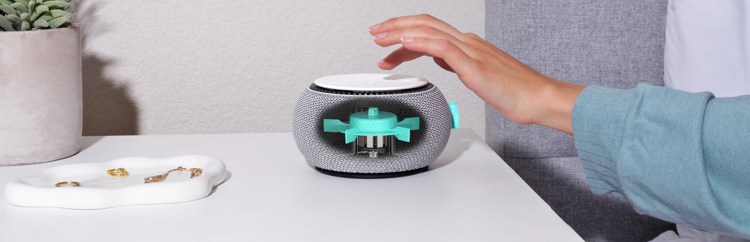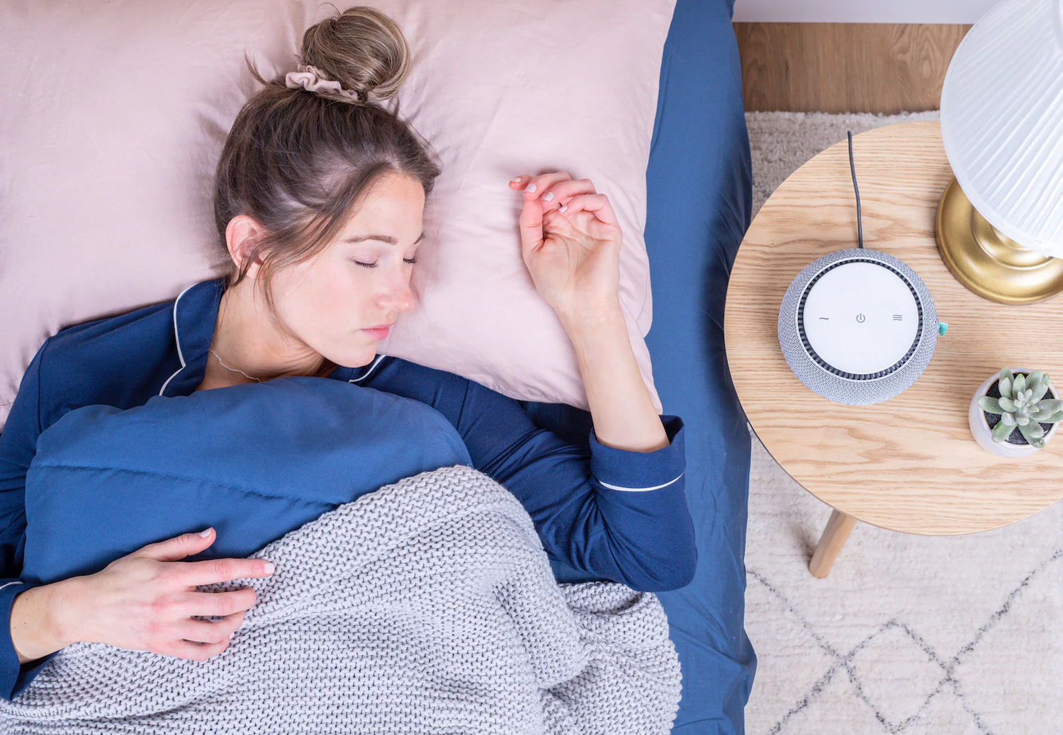 A white noise machine (also known as a sleep machine) produces peaceful, soothing background noise that helps mask disturbances in your sleep environment and serves as an environmental cue for your brain that it is time to sleep. The SNOOZ White Noise Machine contains a mechanical fan that spins to generate calming white noise.